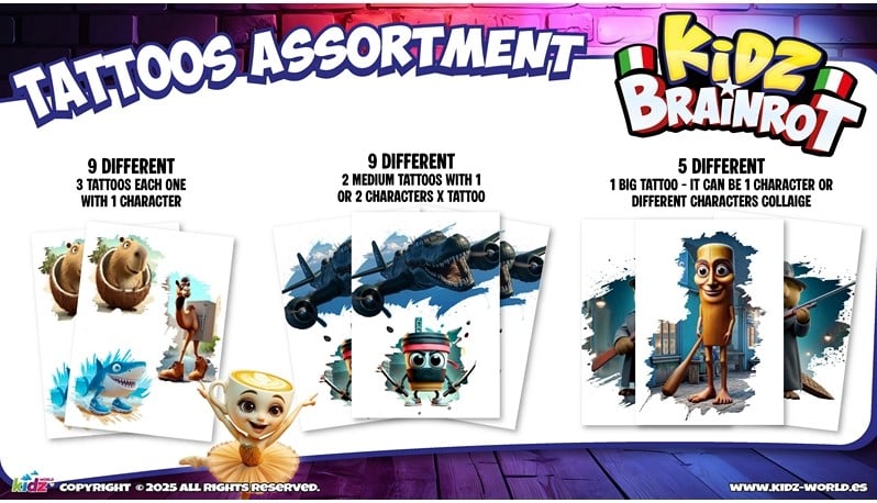 Italian Brainrot holographic kort samt tatoveringer