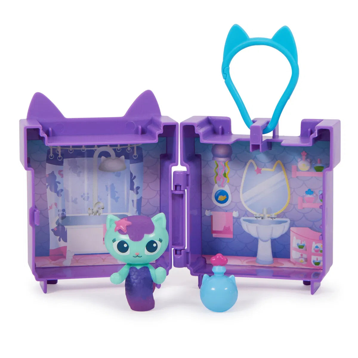 Leg på farten med Gabbys Dukkehus Mini-legesæt m Clips. Dette bærbare legesæt indeholder Gabbys kat-tastiske venner, fx Havkat på det supersøde dukkehusbadeværelse, og sættet er med en plastikclips, så du kan tage det med dig overalt. Fans af Gabbys Dukkehus vil elske at hænge dette minilegesæt på en taske eller rygsæk og tage på spændende dukkehuseventyr, uanset hvor de går hen. Tag minilegesættet med dig i bilen, i toget eller måske endda i et fly. Når du har sat dig, kan du åbne legesættet for at afsløre et minidukkehusrum, som gør det muligt at genopleve dine yndlingsscener fra serien. Ligesom Gabby gør i begyndelsen af hver episode, skal du nu pakke din særlige dukkehuslevering ud for at opdage legetøjssættets overraskelsestilbehør - en parfumeflaske, som du kan bruge på dit legeeventyr. Når legen er slut, kan du putte Havkat og dit tilbehør ind i legesættet og klikke det på din rygsæk, indtil det er tid til at lege igen. Vil du på endnu flere spændende dukkehus-eventyr, kan du samle alle de tre Gabbys Dukkehus Mini-legesæt, som kan stables, f.eks. Æskebarns krea-værelse og Muffins køkken (sælges separat). Vil du have en sidste overraskelse, kan du scanne QR-koden inde i dukkehusleveringen for at låse en særlig belønning op i den gratis Gabby’s Dollhouse App (tilgængelig på iOS og Android). Gabbys Dukkehus plyslegetøj, figurer og legesæt er det perfekte legetøj til børn, der elsker at bruge deres fantasi til at skabe deres egen dukkehusverden.