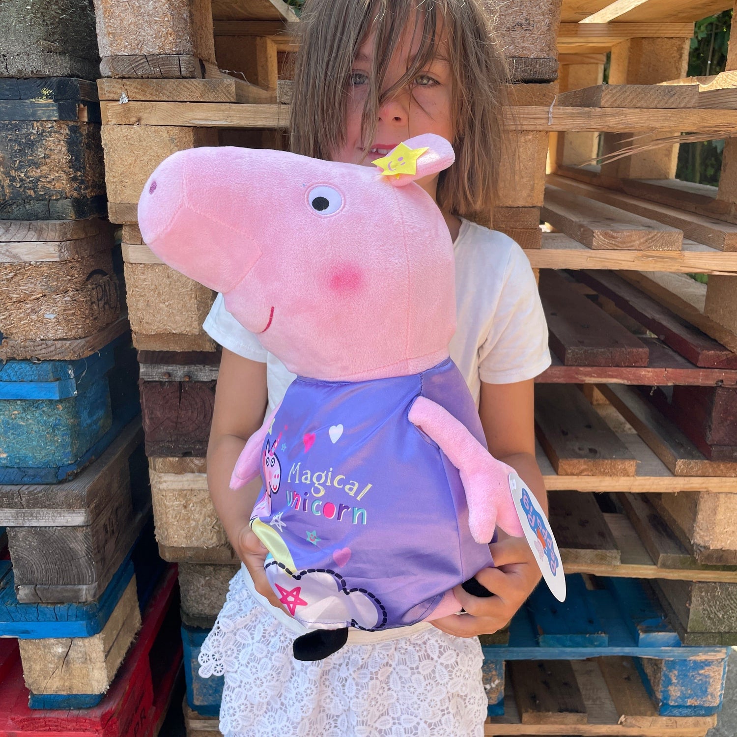 Gurli Gris i en lilla unicorn kjole med teksten "Magical unicorn" og en stjerne på det ene øre.