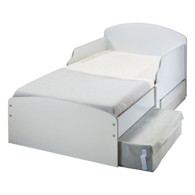 Hvid børneseng med 2 opbevaringsskuffer under sengen
