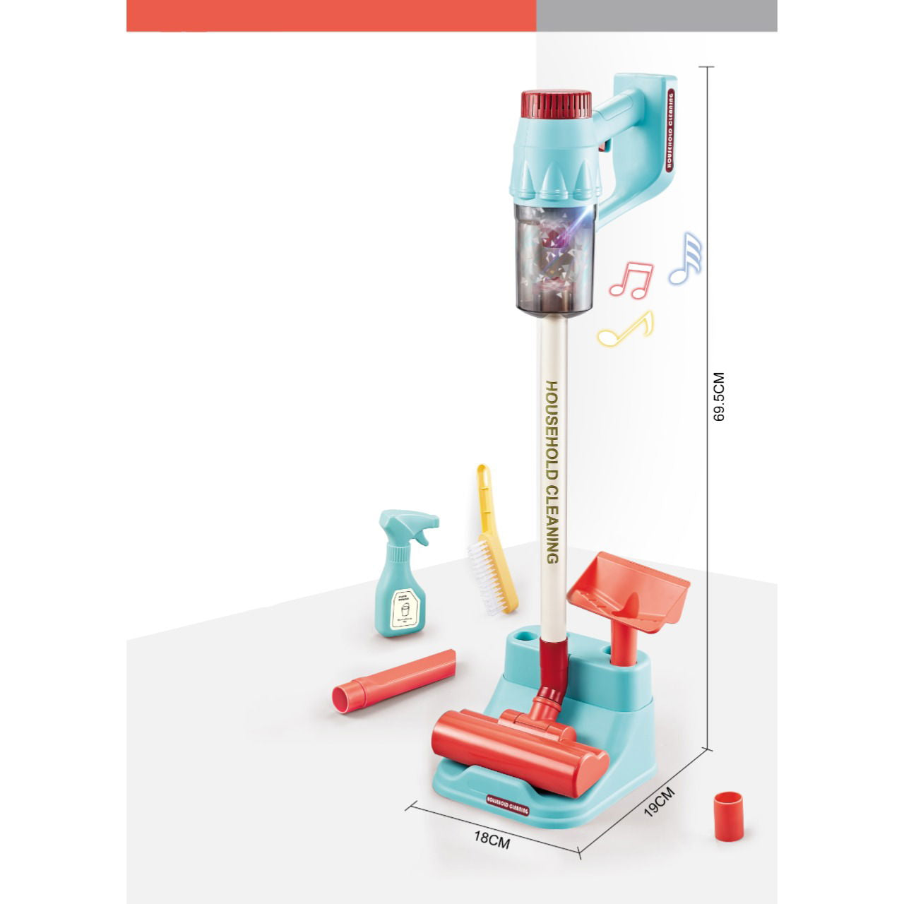 Med dimensionerne 18x19x69,5 cm er denne legetøjsstøvsuger ideel til børn at lege med derhjemme. Den er nem at håndtere og transportere, så børnene kan støvsuge i hele huset!