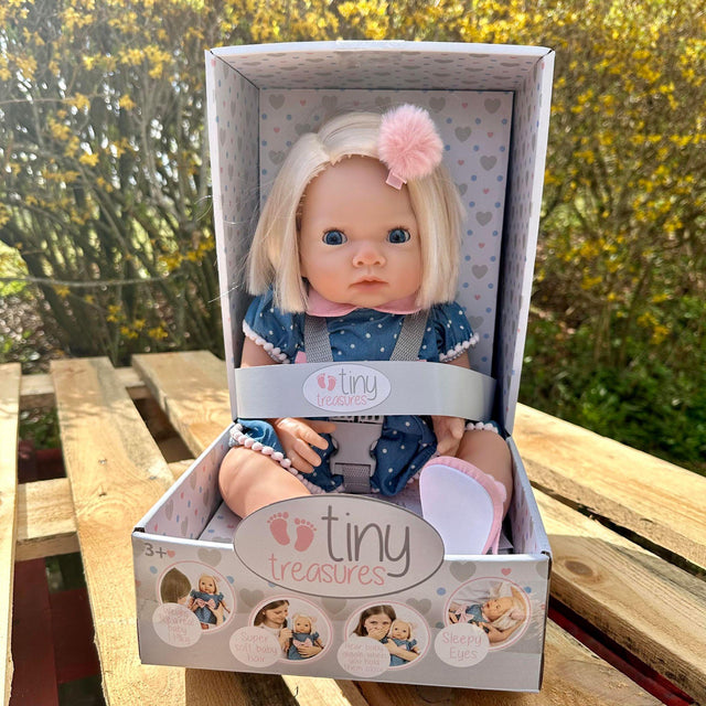 Næsten som en rigtig baby. Tiny Treasure dukken er tungere end de fleste dukker og føles derfor som en rigtig baby i den lille dukkemors arme. Og hende her fniser, når hun krammes og er ikke til at stå for.