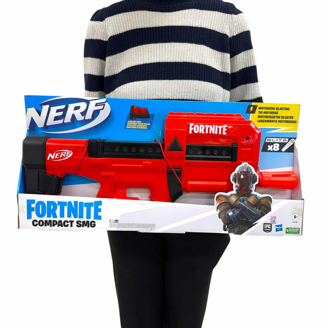 Nerf Fortnite Compact SMG-blasteren er inspireret af udstyret fra Fortnite og leveres med Ultra Red Wrap-designet fra det populære computerspil! Lad pilene fyge om ørerne på modstanderne med denne fuldautomatiske pileblaster, som skyder 8 pile af sted efter hinanden. Hold accelerationsknappen nede for at tænde for motoren, og tryk på udløseren for at affyre 1 pil. Compact SMG-blasteren leveres med 8 officielle Nerf Elite-skumpile, som lægges i blasterens indbyggede magasin. Officielle Nerf-pile er fantastiske til både indendørs og udendørs kampe, og deres holdbarhed og kvalitet er afprøvet og godkendt. Et gummibelagt greb gør det let at holde på blasteren, mens du sigter. Brug af en form for briller anbefales (medfølger ikke). Fortnite-mærker og copyright 2025 Epic Games, Inc. Hasbro og alle relaterede betegnelser er varemærker, der tilhører Hasbro. Ekskl. 4xAA batterier. Fra 8 år.