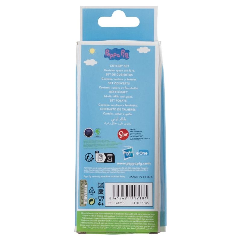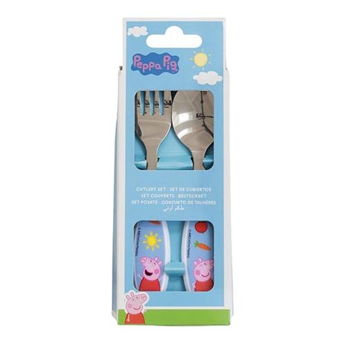 Sæt bestående af en metalske og -gaffel, så dit barn kan lære at bruge voksenbestik ved måltiderne på en sjov og sikker måde, takket være deres afrundede form.