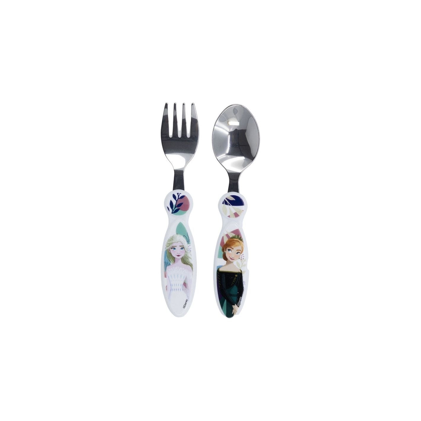 Sæt bestående af en metalske og -gaffel, så dit barn kan lære at bruge voksenbestik ved måltiderne på en sjov og sikker måde, takket være deres afrundede form.