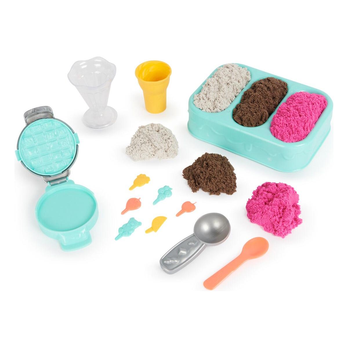 Kinetic Sand Isdessert lækkerier-legesættet bringer glæden ved en isbar lige ind i dit hjem! Børn kan bruge de 6 redskaber med is-tema til at øse, forme og skabe deres helt egne islækkerier. Bland det lyserøde, brune og hvide Kinetic Sand for at opfinde nye farver og smage, og sæt derefter prikken over i'et med det sjove tilbehør. Dette legesæt motiverer kreativitet, fantasi og udvikling af finmotorik gennem følesansende leg.